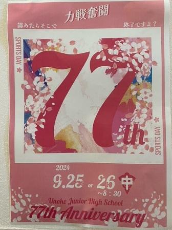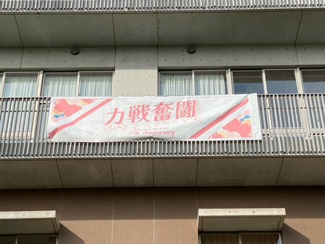 いよいよ明日の運動会に向けて準備が整いました。最後の仕上げとして、生徒会のメンバーが、スローガンの「力戦奮闘」の幕を全校生徒が登校する際に見てほしいと2カ所に準備をしました。この幕は、生徒会長がデザインしたもので、この日のために3連休に作成したそうです。明日は、全員が登校した後には、グラウンドに移すそうです。
