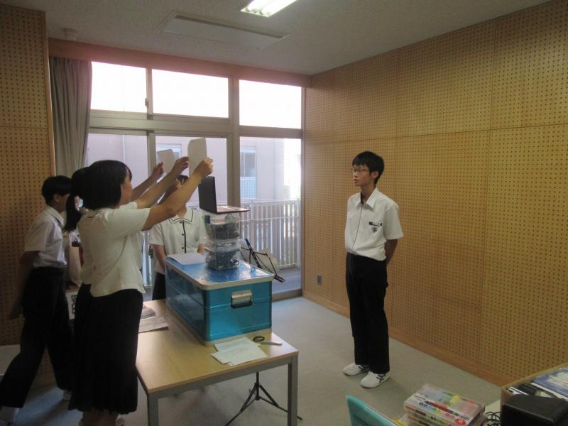 本日は今年度の後期生徒会役員選挙が行われました。どの候補者も緊張した様子で演説を行い、自分の考えを伝えていました。教室で見守る人たちは、演説が終わると温かい拍手を送っていました。
