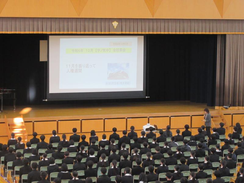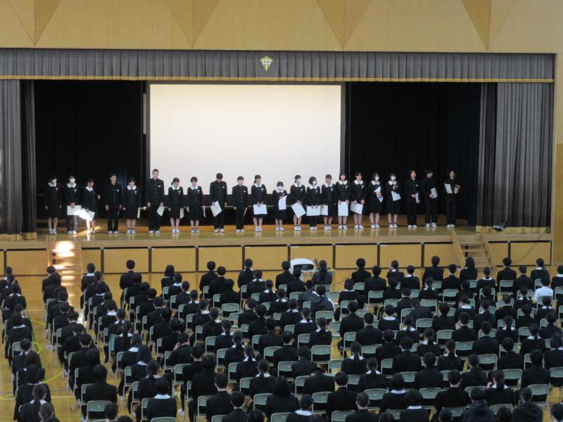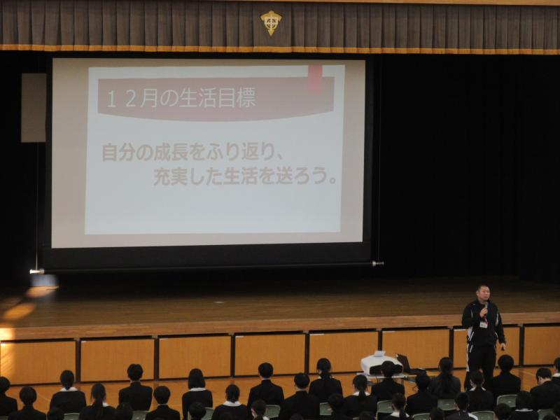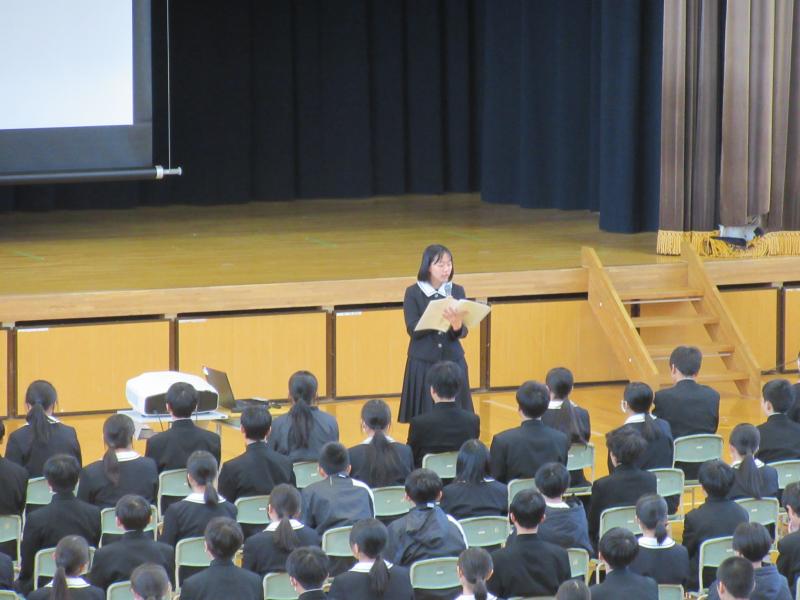 生徒指導担当の先生からは、規則正しい生活を送り、有意義な冬休みにしてほしいと話がありました。注意してほしいこととして、SNSのトラブルに巻き込まれないこと、これから雪が降ると道路状況が悪くなるので十分注意をすることがありました。そして「自分の命は自分で守る」ことを一人一人考えて行動してほしいと話していました。