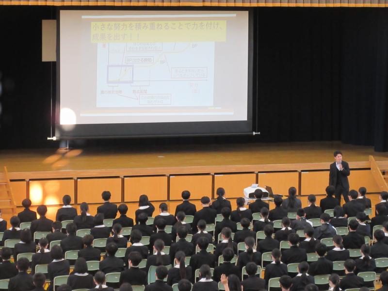 本日、金沢龍谷高校の居村先生を講師として「ペップトーク」の授業をしていただきました。ペップトークとは、アメリカのプロスポーツが発祥と言われており「前向きな背中のひと押し」「相手や自分の気持ちを最適化する言葉かけ」という意味があります。人は「ネガティブ」に反応しやすくネガティブ感情はポジティブ感情の10倍から20倍も過剰反応をするそうです。居村先生からは「成功のイメージと前向きな心の状態を作ってポジティブな言葉を出すことが大切」「なりたい自分になるために、言葉選びをしてほしい」など前向きな言葉をたくさん頂きました。
