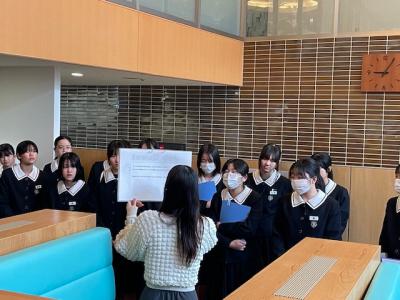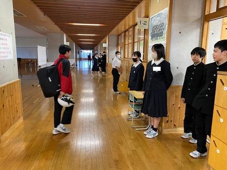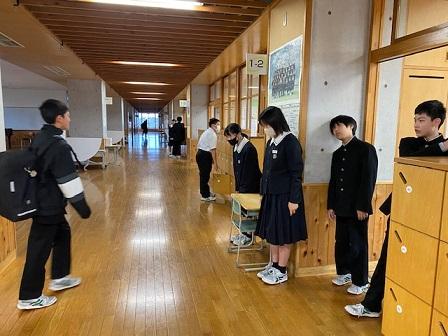 12月の全校集会で「自分の考えを発信しよう」と伝えたところ、1年生の三役会では「朝の挨拶運動」を計画し、教室の前で友達を迎える取組を行っています。今年は、地域の方やお客さんに「素敵な挨拶ですね」と言ってもらえることが多く、この取組で一人一人の挨拶の意識が更に向上することを願っています。