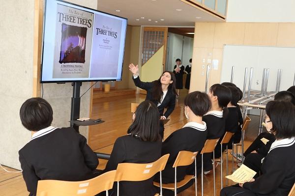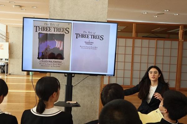 本日の昼休みにALTのミカエラ先生による読み聞かせが実施されました。今日は、フロリダにお住まいのミカエラ先生のお母様から送られてきた「THREE TREES(3本の木)」という絵本の読み聞かせでした。3本の木はそれぞれ将来の夢を持っていたのですが、夢が叶わなかった3本の木…。そこから私達は何を思い、何を考えるかという少し難しい内容の絵本でしたが、約30名の生徒が集まり大変和やかな「読み聞かせ」の時間となりました。