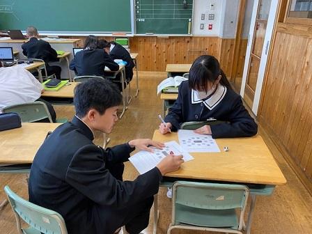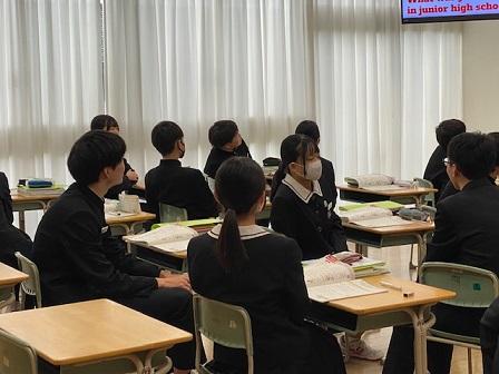 3年生の英語の授業では、「What was your best memory in junior high school ?」を題材として、中学校生活を振り返り、英語で聞いたり、話したりする「Small Talk」を行っていました。修学旅行について話をしている生徒が多かったです。