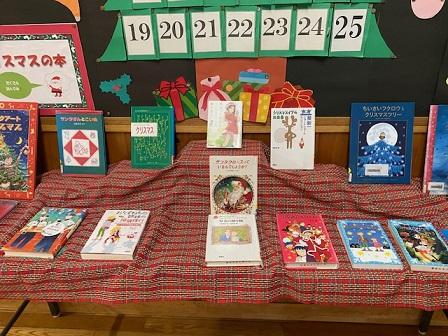 また、図書館の掲示板がクリスマス一色になりました。ツリーのアドベントカレンダー(イブまでの日数を数えるカレンダー)やクリスマスに関係する本の紹介などが展示されています。