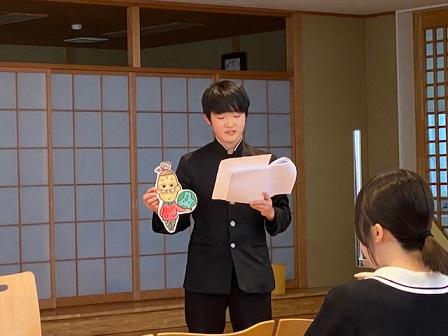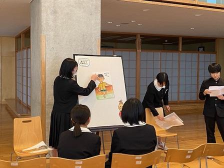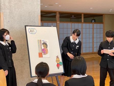 本日の昼休みに、図書委員会によるパネルシアターが行われました。12月10日は「世界人権デー」ということで、一人でも多くの生徒に世界の現状について聞いてほしいと、メンバーが考えてきました。世界のストリートチルドレンがテーマである「もったいないばあさんと考えよう世界のこと」というお話しを上演しました。