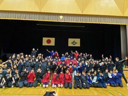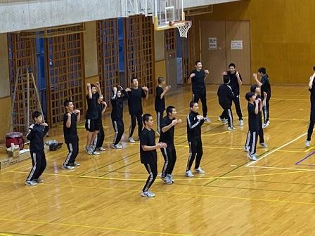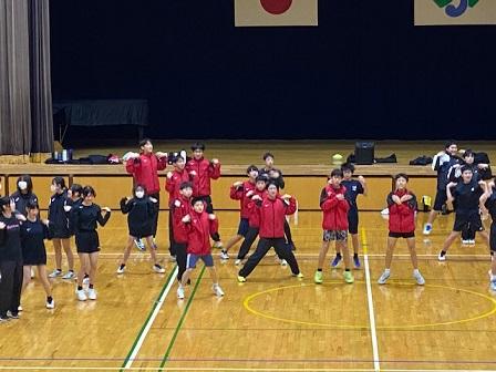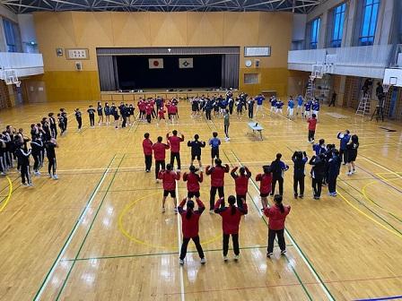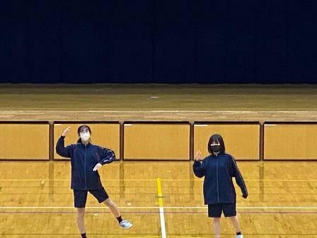 本日は、藤中先生による「リズムトレーニング」を行いました。最初に上半身と下半身の連動の動きを練習した後に、1本のラインを使ってジャンプ系のトレーニングを行いました。藤中先生からは「失敗してもやり続けることが大切」「周りの手拍子や声かけで、パフォーマンスが上がる」など、各部活動でも使える多くの言葉を頂きました。スタート時は恥ずかしがっていた表情も、トレーニング後半はたくさんの笑顔が見られました。