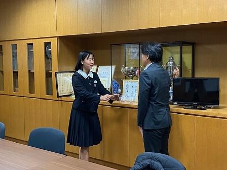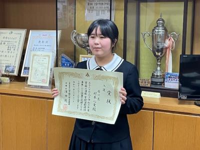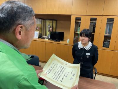 本校3年生の村本心美さんが「国土緑化運動・育樹運動標語」において『国土緑化推進機構理事長賞』を受賞しました。本日、国土緑化推進本部の担当者が来校され、村本さんに賞状を手渡しました。標語は全国から17,621点の応募があり、見事入賞10人の中の一人に選ばれました。村本さん、本当におめでとうございます!