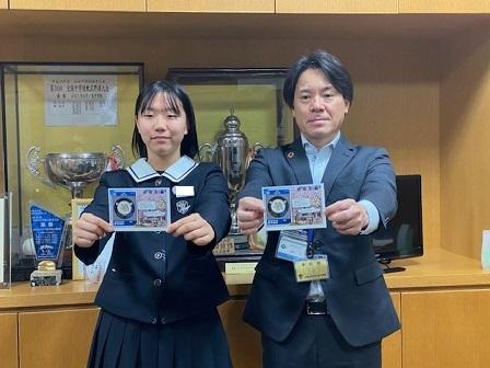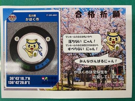本日、かほく市役所産業建設部の庭田部長より、合格祈願のマンホールカードが贈られました。これは、マンホールの蓋が丸いことから「落ちない」そしてデコボコがあることから「すべらない」にかけて、かほく市役所が平成28年からはじめた取組であり、毎年市内3中学校の3年生に贈られているそうです。