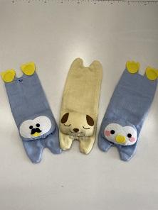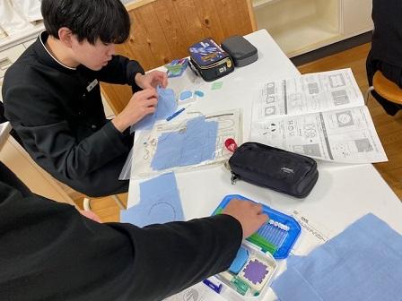 3年生の家庭科の授業では、アイピロー(中に保冷材やカイロを入れて、目を癒すグッズ)の制作をしています。デザインは「イヌ」「ペンギン」「ブタ」の中から好きなものを選んでおり、顔の表情はそれぞれのアイデアで作るそうです。縫い目が荒くなって「それやったら綿が出てくるぞ」と友達から言われている生徒が数人いました。写真は先輩達が作ったものですが、完成は来年になってからの予定だそうです。