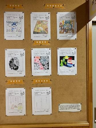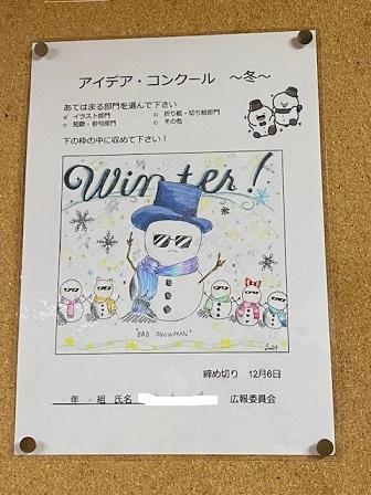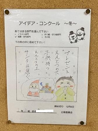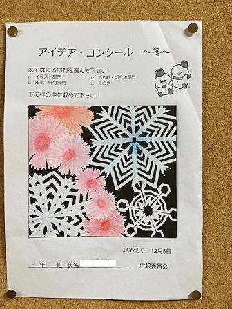 広報委員会の取組として「アイディアコンクール冬」が開催されました。この取組は毎年実施されていますが、今回はイラスト部門、折り紙・切り絵部門、短歌・俳句部門の3部門で作品の募集をしました。放送室前には、入賞作品が展示されていますが、広報委員会の目的でもある「明るく、楽しい学校にするため」の通り、作品を見る生徒からは笑顔はたくさん見られました。