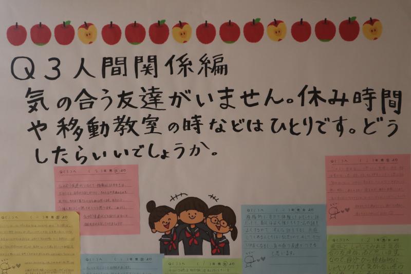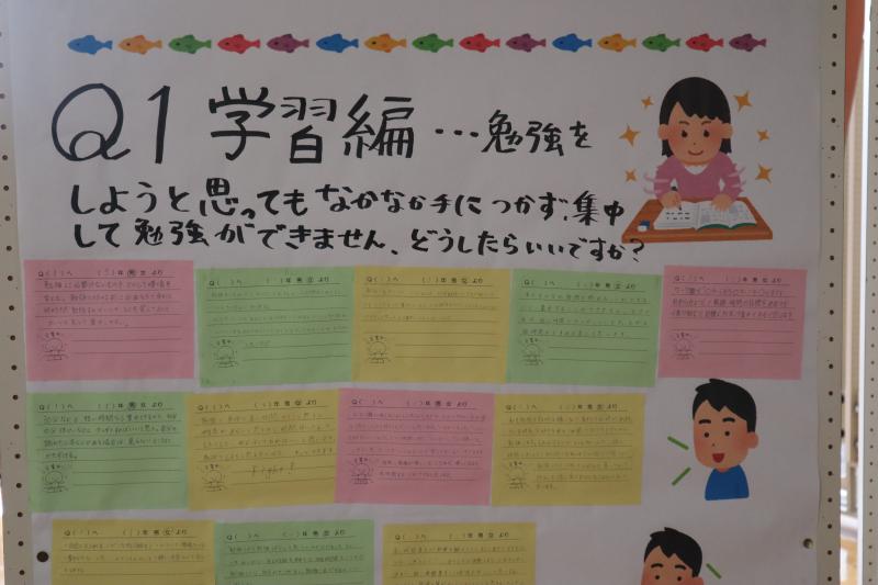 保健委員会による「ピアパーク」の取組が始まりました。みんなが悩んでいると思われる事について、生徒同士がお互いにアドバイスし合うという取組です。生徒玄関ピロティに掲示してあります。