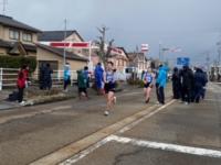 本日、かほく市役所前をスタート、ゴールとして、標記の大会が開催されました。本校から、男子陸上競技部が3チーム、女子陸上競技部が2チーム、男子バドミントン部が1チーム出場しました。大変寒い日となり、8時50分スタートの小学生の部は、吹雪いていましたが、中学生の部では太陽も顔を出してくれました。