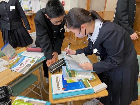 12月の全校集会で「自分の考えを発信しよう」と伝えたところ、1年生の三役会では「朝の挨拶運動」を計画し、教室の前で友達を迎える取組を行っています。今年は、地域の方やお客さんに「素敵な挨拶ですね」と言ってもらえることが多く、この取組で一人一人の挨拶の意識が更に向上することを願っています。