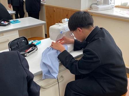 2年生の家庭の授業では、「袋づくり」を行っています。布と布を合わせて縫っていく作業は、どの生徒もスムーズに行っていましたが、紐通し口や脇がほずれないよう何度かミシンをかける部分に苦労していました。完成した袋を早く見たいですね。