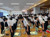 その後、実際にきれいな立ち姿や挨拶のコツを教えて頂き、全員でやってみました。広域マネージャーの川北さんからは「宇ノ気中の生徒の挨拶はいつ来ても素晴らしい!」と褒めて頂きました。
