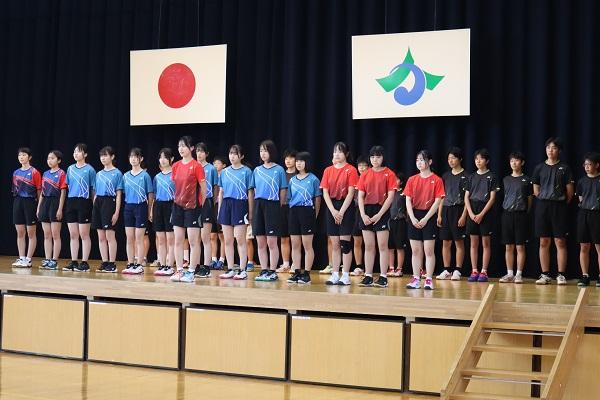各部の選手がユニフォームを着て、吹奏楽部の演奏で颯爽と登場しました。顧問の先生から選手紹介があり、各部長からは大会に向けた抱負が述べられました。生徒会書記と校長先生からの激励の言葉の後に、女子バレーボール部長から「このような激励会をして頂き感謝しています。大会当日は一生懸命頑張ります!」と力強い挨拶がありました。
