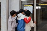 本日、令和5年度の学級発表がありました。1年生の発表時間の10時を回ると多くの新入生が玄関前に詰めかけました。「やったー、同じクラスや」「隣のクラスだったね」など、楽しそうに話をしていました。