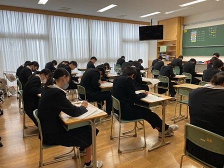 本日、第3回統一テストが行われました。校内で風邪やインフルエンザ等が流行っており心配をしていましたが欠席者は少なく、3年生は緊張感を持って取り組んでいました。(欠席している生徒は早く良くなってください)19日(火)からは三者懇談会が予定されています。進路決定に向けて1日1日を大切に過ごしてほしいと思います。