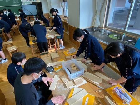 1年生の技術の授業では、「木箱」の組み立てを実施していました。板の表面をこすったり、板の高さを合わせたりと完成のためには重要な時間となりました。「ボンド付けるし、持っとって~」「高さ合わんかったら仕上げできんよ」など、1年生の授業はいつ見ても活発で元気な様子です。2学期はあとわずかですが、完成品を見ることを楽しみにしたいと思います。