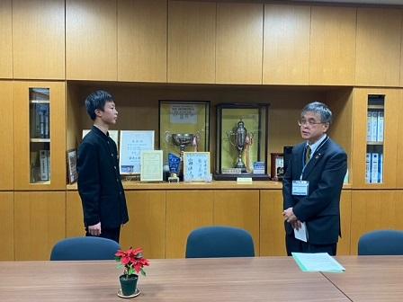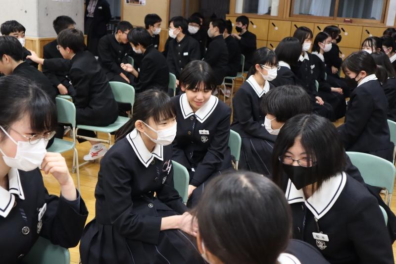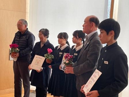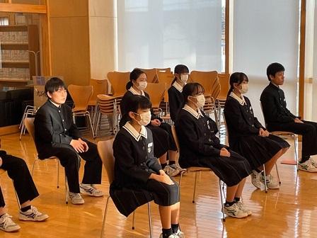 贈呈式では、生徒会長の本田さんが3年生を代表して、カードを受け取り、「入試に向けて頑張ります」とお礼の言葉を述べました。2学期も残り1週間となりました。頑張れ、宇中生!