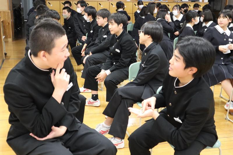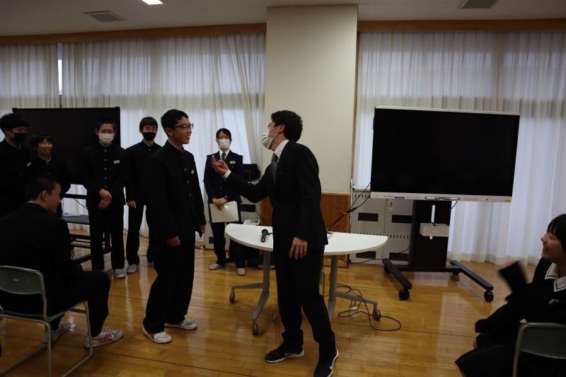 講義の後半には、2人1組になり「誘われたときの断り方」をロールプレイングで行いました。最後に、盛本先生が誘い役となって、「ちょっとでいいからやってみんか・・・」と野球部キャプテンを何度も誘ったのですが、さすがキャプテン!しっかり断ることができていました。