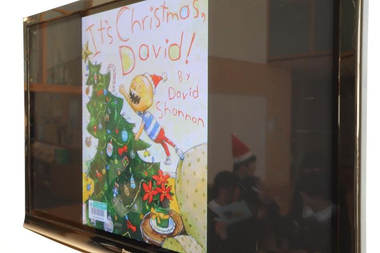今年もあと10日ほどでクリスマスとなります。本日のお昼休みに、ALTのアニーシャ先生による読み聞かせが行われました。赤い帽子を被ったアニーシャ先生は「クリスマスだよ、デイビッド!」という人気のデイビッドシリーズの1冊を読んでくれました。