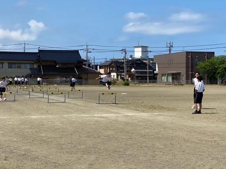 この学級は、ハードル走が上手な生徒が多く、膝を折りたたむことが難しい抜き足もとてもスムーズです。次はタイム測定です。今週はとても爽やかな気候が続いており、生徒は何度もチャレンジしていました。