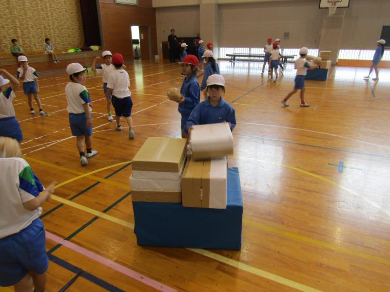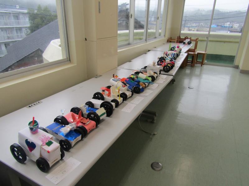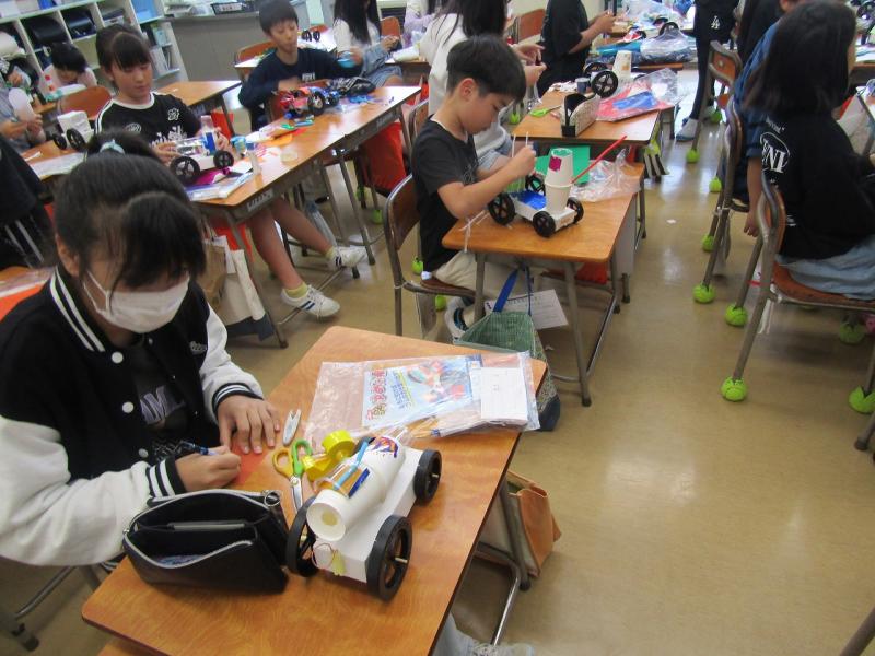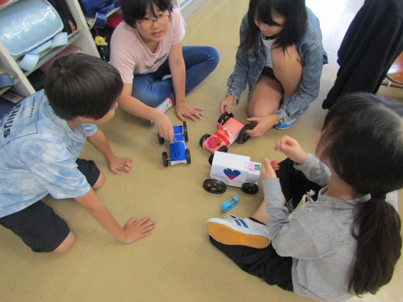 ゴムで動く仕組みを生かして、動く乗り物をつくっています。