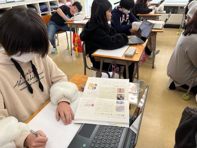 机の上には、一人一台端末や参考にする辞典などが並でいました。