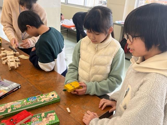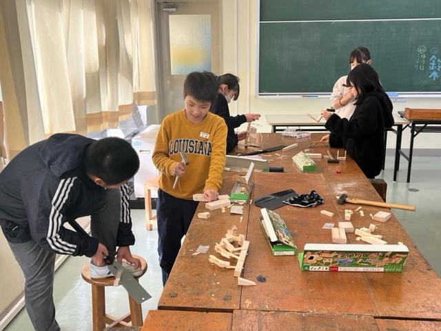 のこぎりを使っての作品作り。4年生が、動くおもちゃを作っていました。