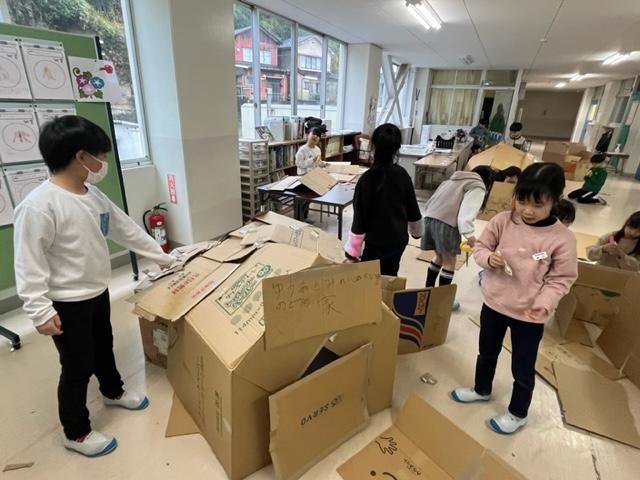 1年生の教室や学習室にはどんぐりや松ぼっくり、お菓子の箱や空き缶などの身の回りにある材料で作られたゲームがたくさん並べてありました。