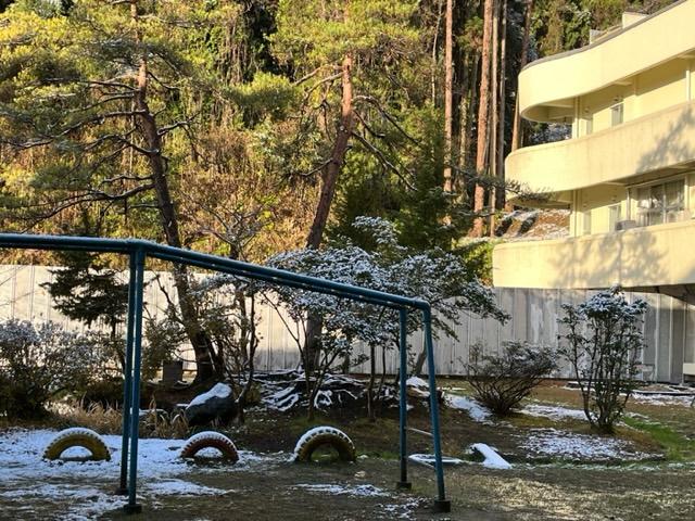 158名の宇出津っ子。中庭の池も、遊具も、早くみんなが来ないかと待っているように見えます。