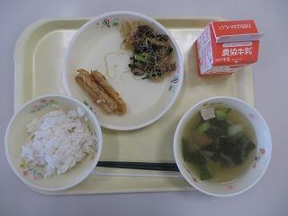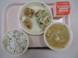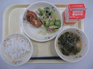 わかめご飯 鶏肉のから揚げ いかくんサラダ みそ汁 牛乳