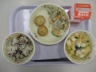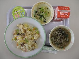 炊き込みご飯 シューマイ ごぼうサラダ なめこ汁 牛乳