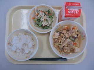 むぎいりごはん たこ焼き 中華あえ けんちん汁 牛乳