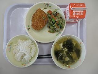 わかめごはん メンチカツ ビーンズサラダ みそ汁 牛乳