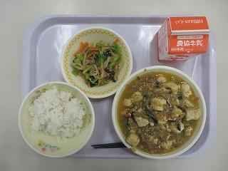 むぎいりごはん 豆腐の中華煮 ごまあえ 牛乳