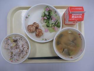 さつまいもごはん 鶏肉のから揚げ サラダ みそ汁 牛乳
