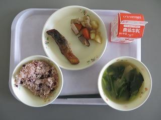 あずきご飯 魚のてりやき風 煮しめ みそ汁 牛乳
