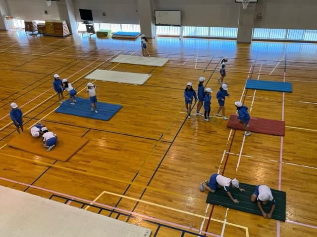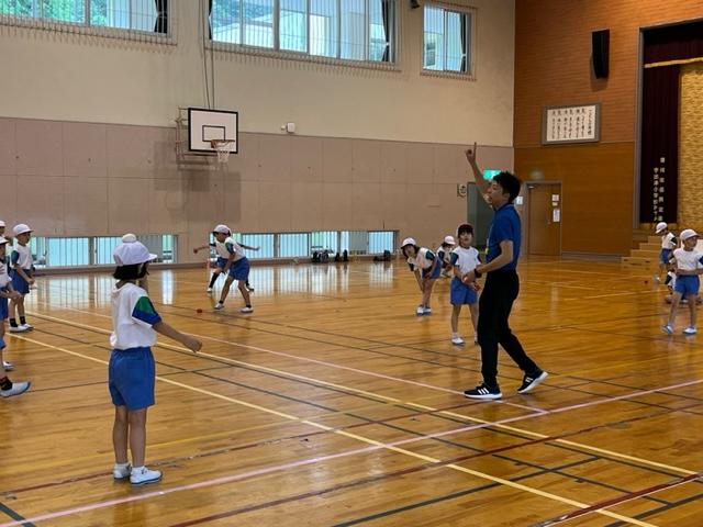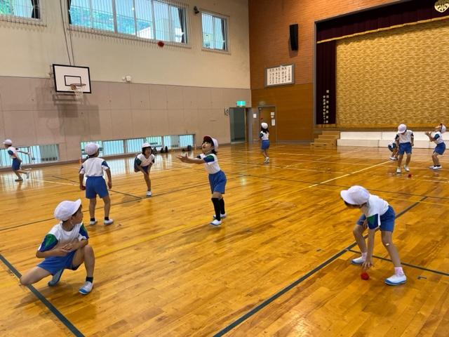 1年生は、赤色と白色のお手玉のようなものを使って、遠くに投げる練習をしていました。キャッチも上手にしていました。