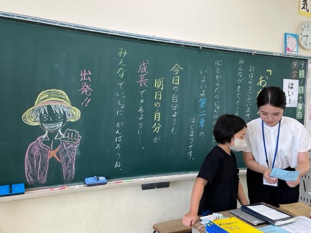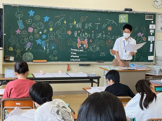 今朝、教室の黒板には、1学期を振り返って、担任からのメッセージが書かれている学級がありました。