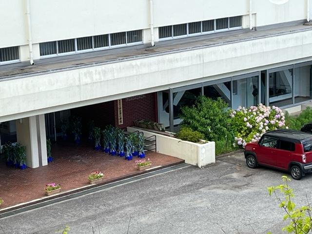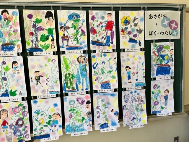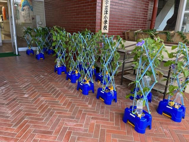 児童玄関には大事に育ててきたアサガオが並んでいました。