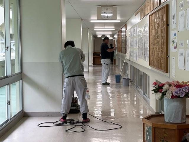 校舎内では、校務員の方が廊下のワックスがけをしてくれていました。