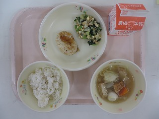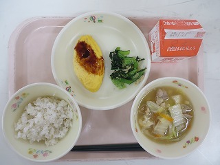 麦入りご飯 オムレツ きりざい とり野菜 牛乳