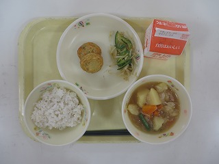 麦入りご飯 野菜の五色揚げ もやしのナムル 肉じゃが 牛乳