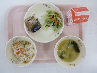 竹の子ごはん サバの味噌煮 おひたし みそ汁 牛乳