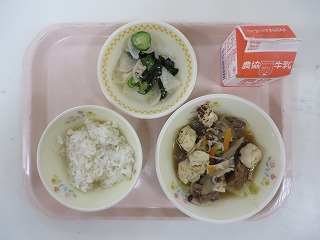 むぎいりごはん すき焼き風煮 和風サラダ 牛乳