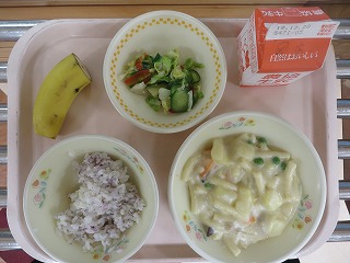 ゆかりごはん マカロニのクリーム煮 きゃべつサラダ バナナ 牛乳