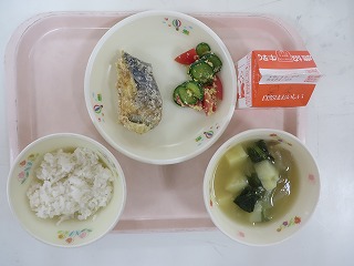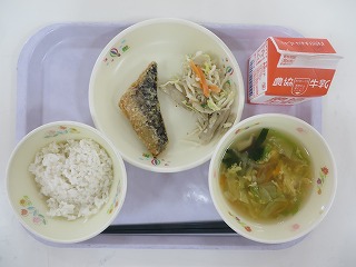 麦入りごはん さわらの甘辛 甘酢あえ みそ汁 牛乳