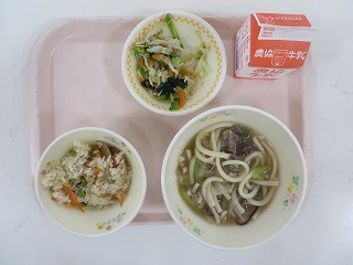 炊き込みご飯 肉うどん おかかあえ 牛乳